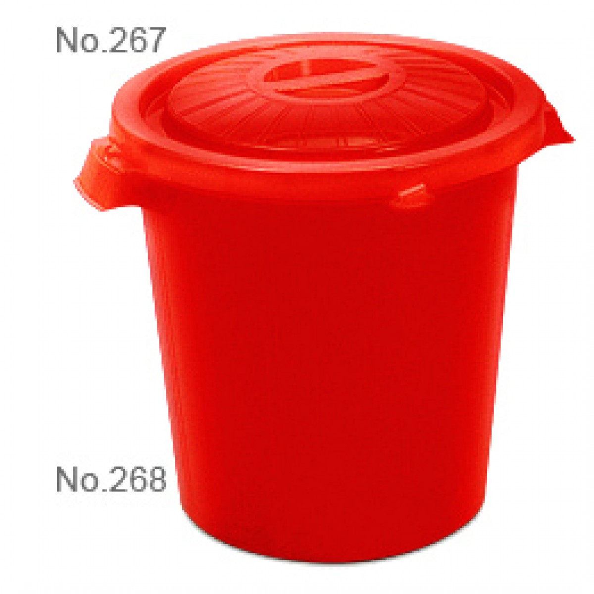 Material complies with FDA standard 塑料符合美國食品及藥物管理局 FDA 標準 。 桶身有扣位可與桶蓋互扣配 。 備有不同呎吋以供選擇 。 可配合型號 267 桶蓋使用,須另行購買。